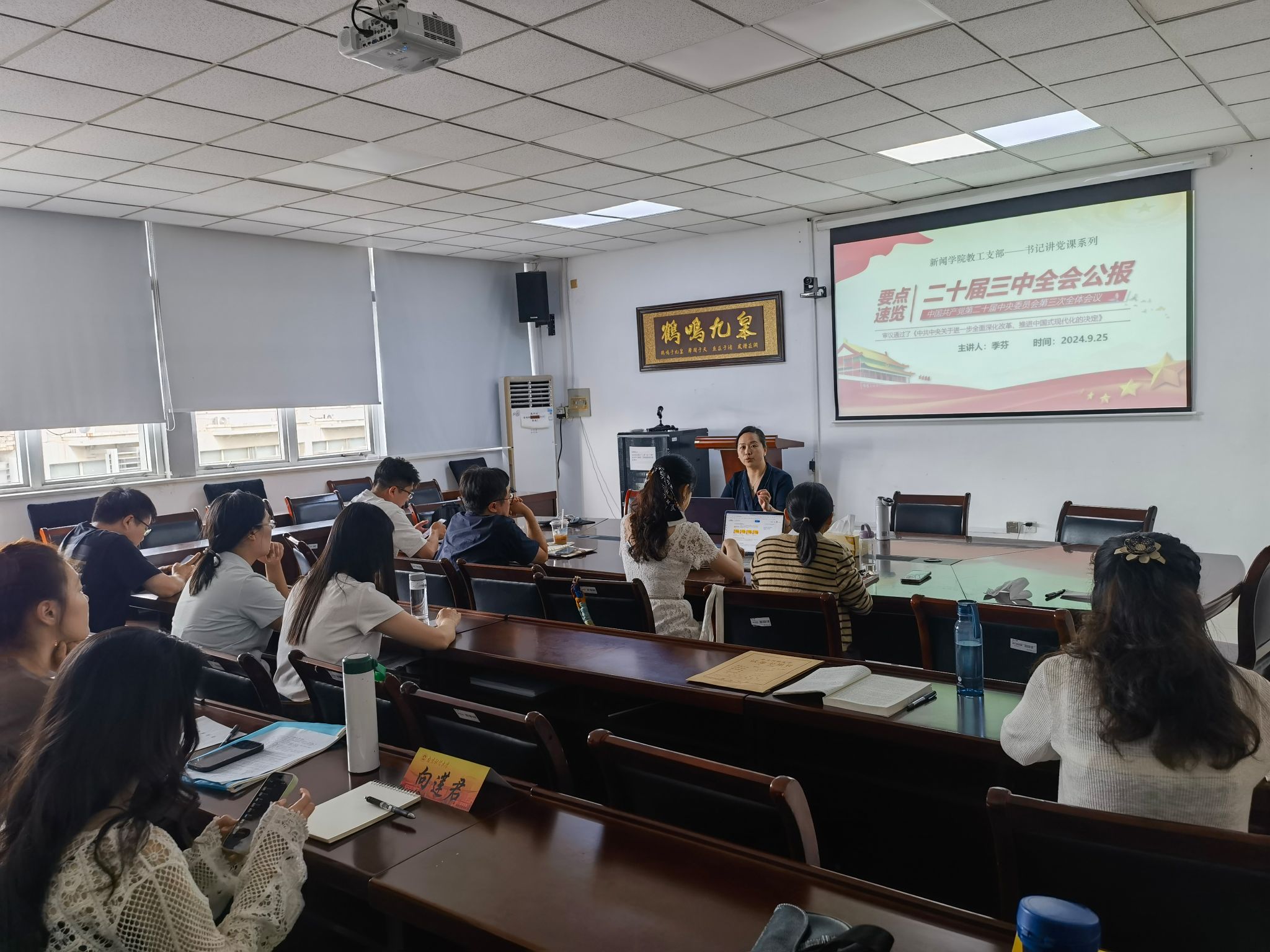 季芬书记指出,《决定》是新时代新征程上推动全面深化改革向广度和深度进军的总动员、总部署,是党的历史上又一纲领性文献,教工支部接下来会以多种形式深入学习贯彻,同志们要深刻领会党的二十届三中全会精神实质,将学习全会精神与新闻教育工作有机结合,对接国家战略需求,创新特色研究路径,在中国特色新闻传播理论基础研究、团队建设、人才培养等方面持续探索,助力国家新闻传播体系建设,确保党中央决策部署落到实处。