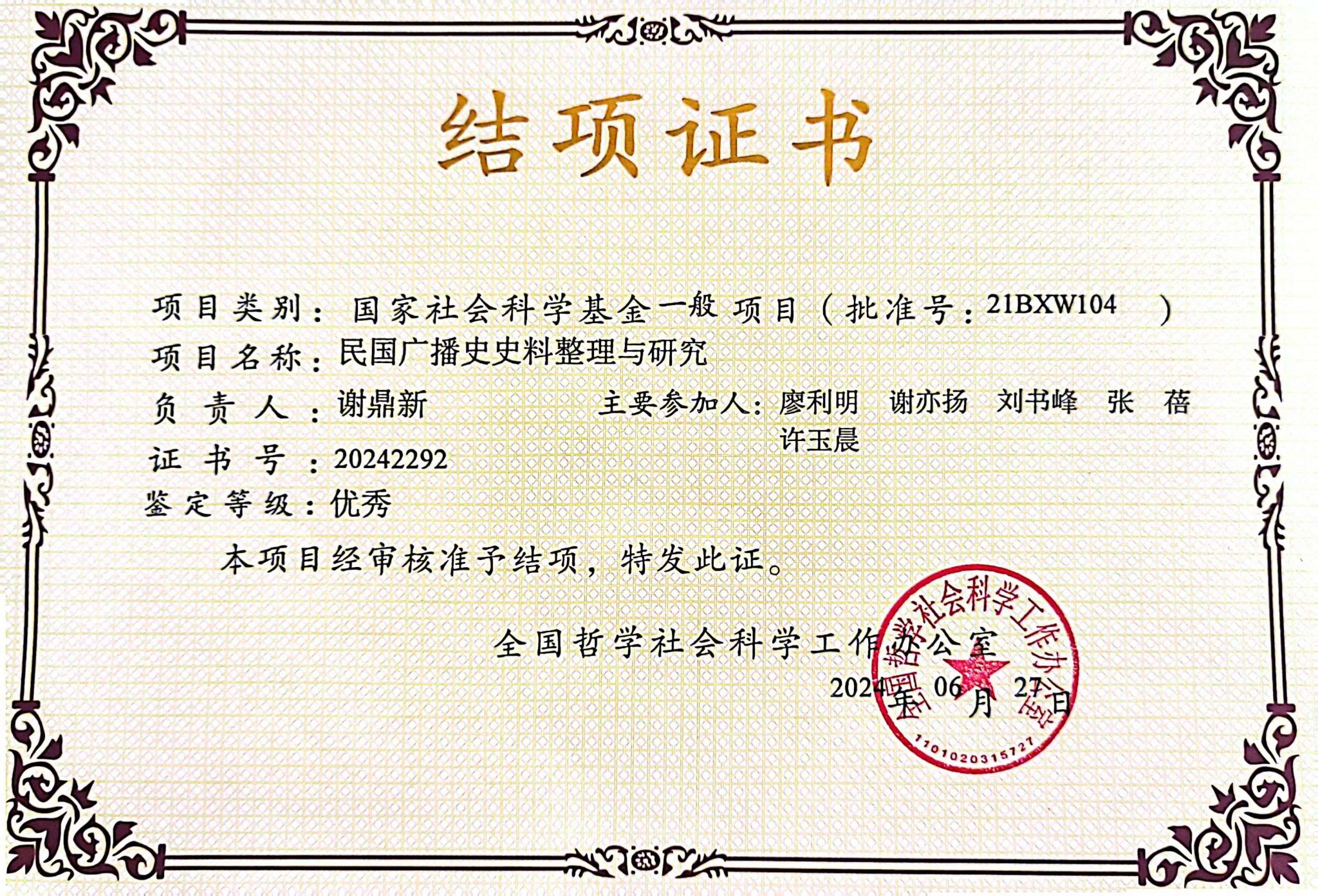 近日:公司谢鼎新教授主持的个人第二项国家社科基金《民国广播史史料整理与研究》结项,喜获“优秀”等级。谢鼎新教授多年来持续在中国广播事业史研究领域辛勤耕耘,也反映公司科研成果质量近年来不断提升。