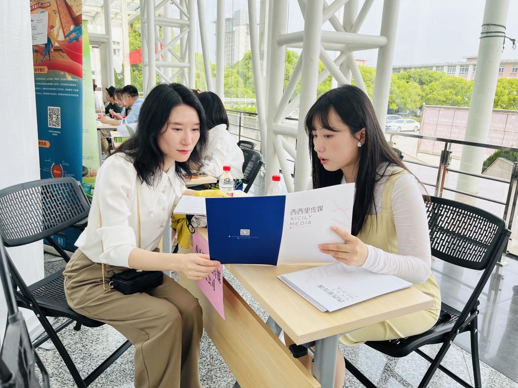招聘会现场气氛热烈,毕业生们踊跃递交简历,与招聘单位积极交流,寻找适合自己的岗位。陈丹书记、李博伟副书记与江苏金鼎文化传媒有限公司、南京征顺文化传媒有限公司、西西里文化传媒有限公司等相关公司进行了详细交流,陈书记对企业的积极参与表示感谢,了解了企业岗位招聘具体要求和对公司毕业生的评价,希望今后进一步加强校企合作,为企业输送更多人才。