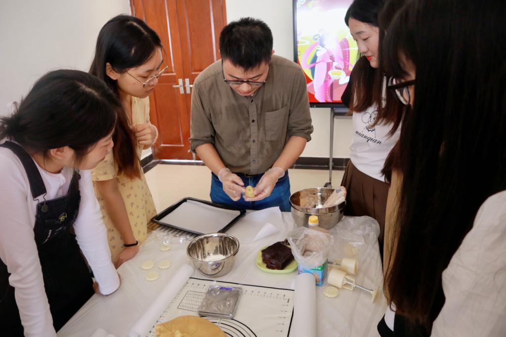 月饼制作前,邱其濛老师向同学们详细讲解了传统月饼的食材搭配、制作流程和注意事项,包括饼皮和馅料的制作,包馅整形的技巧,烘烤的方法等,并亲自示范如何制作完成一个月饼。随后,同学们与邱老师一起围坐,邱老师手把手教同学们使用模具、揉面、包馅、压模等环节。同学们热情地参与活动,讨论着做月饼的要点,大家跃跃欲试,活动现场洋溢着欢乐的气氛。