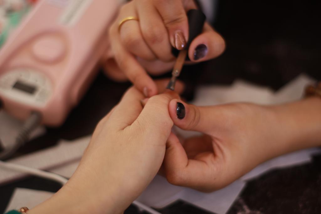 布置轻松的环境,泡上醇香的咖啡,老师们精心选择喜爱的颜色与材料,令人期待的美甲活动在一片欢声笑语中展开。同学首先为老师们修好甲形、清洁指尖、打磨甲面,接着涂上底胶与色胶,做好加固与封层,一枚枚精致的指甲在同学们的细心制作中诞生。