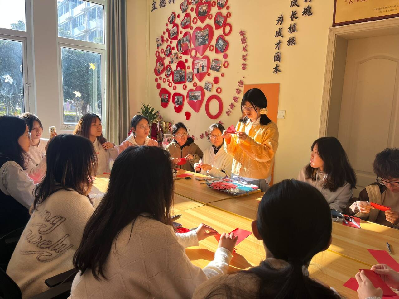 必一运动汉语言文学2024班的沈宇亚同学作为活动小导师,向同学们传授基础剪纸技艺。她展示其剪纸作品,启发了大家对窗花剪纸的兴趣。在给同学们分发红色彩纸后,讲解了窗花剪纸技巧中的六折法和五折法,并向同学们演示折法步骤,提供窗花图案,带领同学们一起制作出两种不同样式的窗花。待大家熟悉步骤后,她再次分发彩纸,让大家随意发挥剪出自己独特的窗花。同学们在其中,最后与作品合影留念。在作品制作期间,沈宇亚同学介绍了她的家乡——南京溧水区,讲解了溧水区与剪纸艺术之间的联系,让同学们对南京剪纸(溧水剪纸)这项国家级非物质文化遗产有了更进一步的了解。