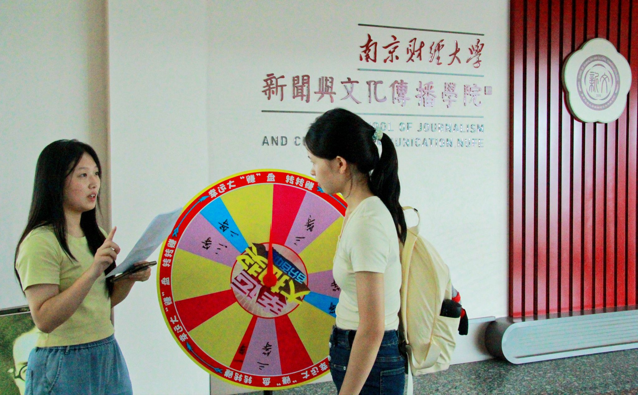 仙林校区德正楼五楼大厅,公司进行了精心布置,巨幅心愿墙上“立好生涯计,未来不焦虑”的标语启迪新生早绘蓝图。新生们纷纷提笔,书写时光期许:勇夺奖学金、投身员工组织、坚持每日阅读……缤纷心愿卡随风轻舞。地面上布置了祝福地贴:“一见倾‘新’是你,满‘新’欢喜是你~”“以热爱为笔,写下独属你的青春注脚!”,为新生入学营造了欢欣热烈的氛围。热闹的迎新场,一轮“新”运大转盘引人驻足,专属“萌新”的开箱仪式巧妙融入的专业趣味问答更添深意:“新闻价值要素知多少?”“传播媒介可曾听闻?”……新生们在欢声笑语间领取奖品,已然经历了别开生面的专业启蒙第一课。