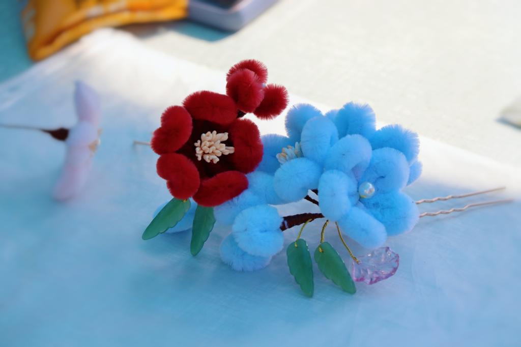 习近平总书记指出:“要保护好、传承好、利用好中优秀传统文化,挖掘其丰富内涵,以利于更好坚定文化自信、凝聚民族精神。”展示活动中,鹿鸣汉服社成员身着汉服,积极向同学们宣传汉服、非遗绒花文化,分发宣传海报,引导同学们参与后续活动。同时,梁雯雯同学向感兴趣的师生同学们分享了亲手制作绒花的过程,让同学们走近非遗绒花,了解精心打磨一件手工艺品的乐趣与不易,使传统手艺在现代校园中呈现出一道靓丽的风景线。