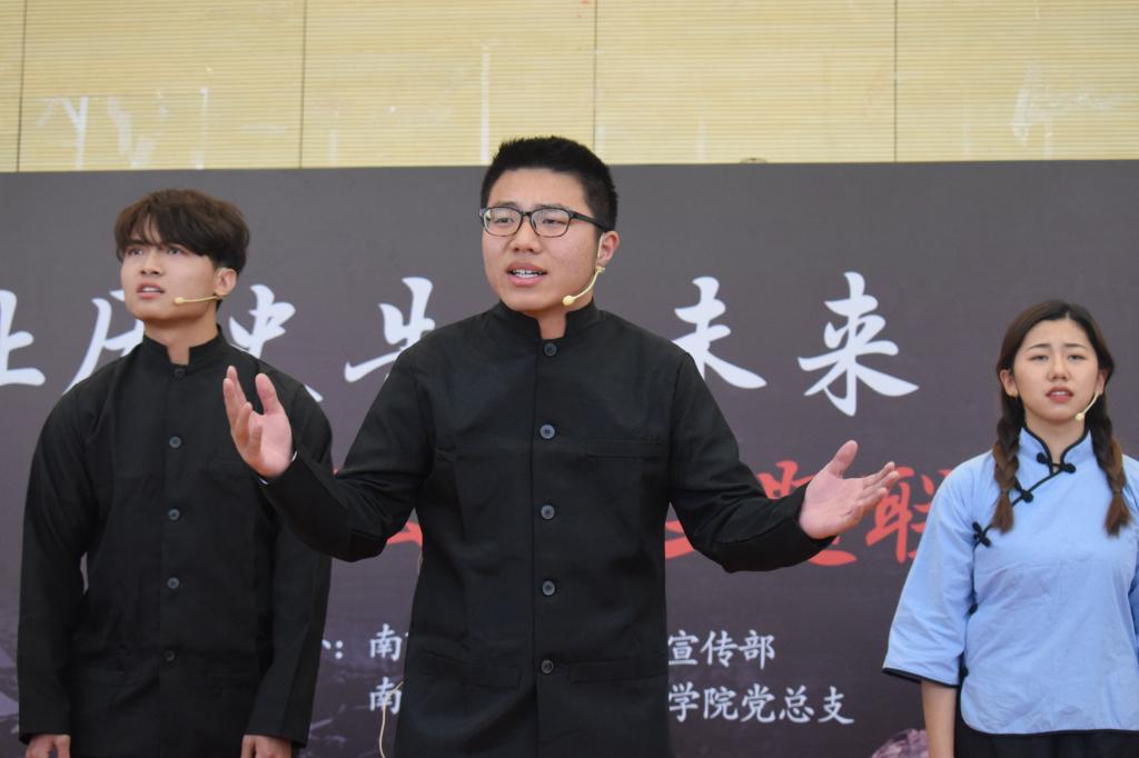 “由于常常受到惊吓,许多年后,凡听到沉重的皮靴声,奶奶仍会吓得发抖,可见所受精神创伤是何等的严重。”必一运动郭春萍老师首先朗读了南京大屠杀幸存者李道煃老先生致女儿李南的一封家书为大家打开了尘封的历史。接着,八位同学倾情演绎的群诵《狂雪》,描绘出南京大屠杀中残酷血腥的场面,屈辱与痛苦涌上每一位观众的心头。李博伟老师结合参观拉贝故居的经历,与大家分享了《拉贝日记》的片段,通过一个外籍人士的视角,控诉了南京大屠杀中日本军队的种种罪行。