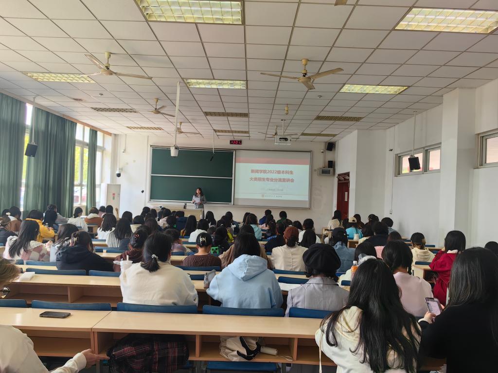 首先,副经理刘霞云针对转专业与大类招生专业分流工作的总体政策和实施细则进行介绍,包括专业分流的范围、专业分流的限额、专业分流的时间、专业分流的成绩以及转专业相关要求等。接下来,新闻系系主任曹志伟向大家介绍了新闻学专业,在介绍专业优势时,曹志伟老师从个人发展角度提出学习新闻学专业更有利于将来从事学术研究工作。曹志伟老师还分享了自己的求学经历用来勉励同学们用积极的心态对待人生道路的选择。网媒系系主任肖璐在介绍网络与新媒体专业时指出网媒专业更注重实践性,侧重培养适应当下互联网发展的复合型信息传播人才,更有利于员工将来的就业。最后,刘霞云副经理向大家介绍了汉语言文学专业的专业特色与就业前景。她指出,汉语言文学专业的包容性非常强,是许多专业的根基所在,学习汉语言文学专业意味着拥有更多的选择。