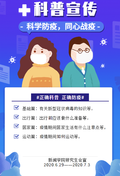 本次宣传科普活动主要分为6个部分:第一部分是基础篇,带大家一起了解新型冠状病毒的定义、传播途径以及新冠肺炎感染者早期的一些症状等。第二部分是出行篇,提醒大家疫情期间出行的一些注意点。第三部分是口罩篇,教大家了解口罩的分类、如何区别劣质口罩、挑选正规口罩以及如何正确佩戴口罩。第四部分是居家篇,主要讲的是疫情期间居家生活的注意点。第五部分是食物篇,给大家带来一份居家饮食指南。第六部分是运动篇,带大家学习如何在疫情期间进行居家锻炼和户外锻炼。